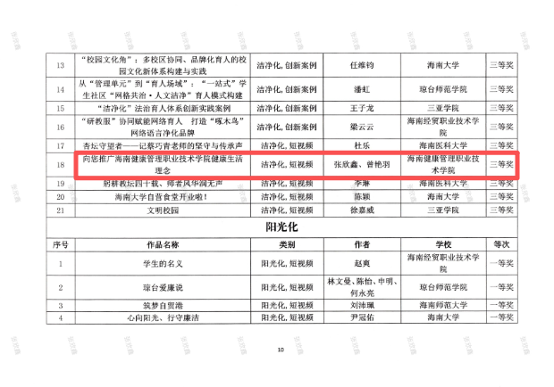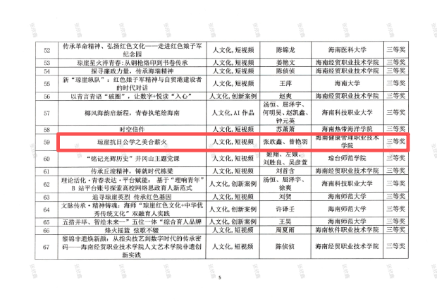 据悉,此次评选围绕“人文化”“绿美化”“洁净化”“阳光化”四类主题赛道展开,集中展示了全省高校在校园文化建设方面的创新成果。参赛作品形式多样,涵盖短视频、AI创作、创新案例等。我院获奖作品中,短视频《琼崖抗日公学之美合薪火》在“人文化”赛道荣获三等奖,《向您推广海南健康管理职业技术学院健康生活理念》在“洁净化”赛道荣获三等奖。